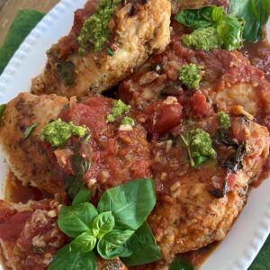 Protein-rich, boneless, skinless chicken breasts are seasoned, dusted lightly in flour, then seared until golden in a rich butter/olive oil blend. They’re then nestled in a simple tomato sauce that’s full of flavor from onions, garlic, basil, white wine and spices and simmered until juicy and tender. A family-favorite!