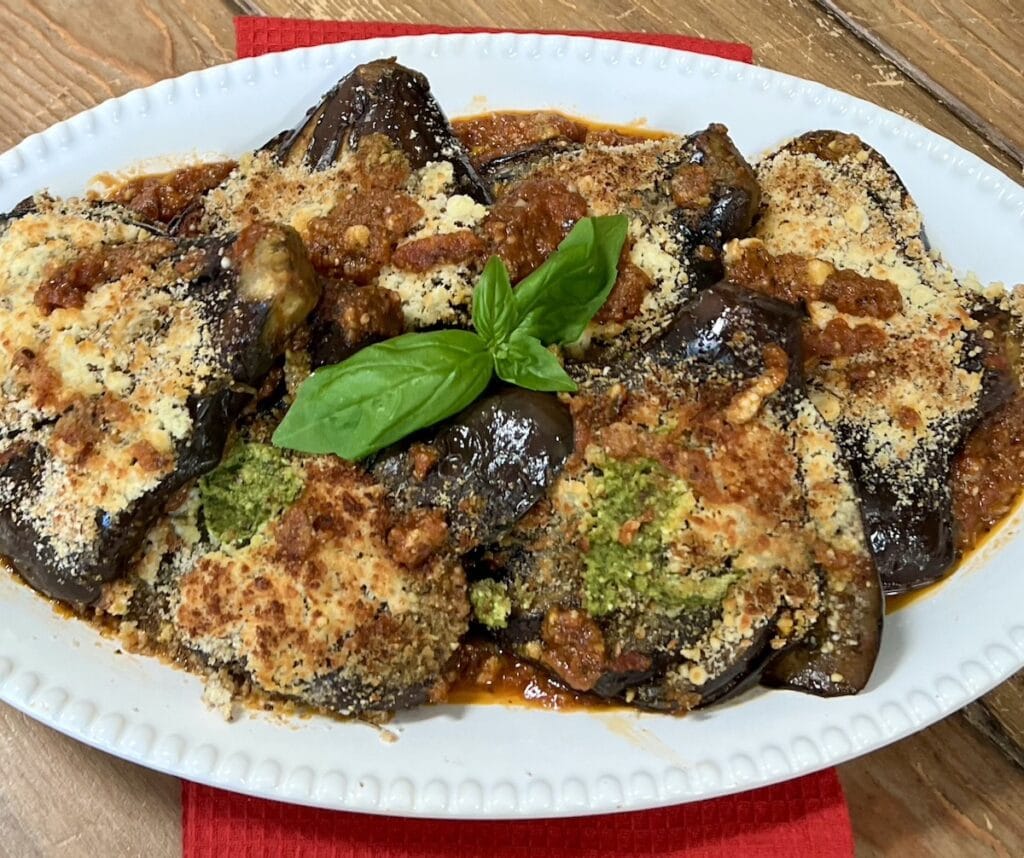 Medium-sized “Italian” eggplant are thinly sliced and fanned out with garlic, spices and tomato basil sauce then roasted until tender. They’re then topped with homemade seasoned breadcrumbs and a grated pecorino and parmigiano cheese mixture and broiled until caramelized.