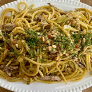 If there is one recipe so uniquely Sicilian that it might even be considered the national dish of Sicily, pasta con le sarde it is. (“Sarde” means ‘sardines” in Italian.) Combining pasta with the deep and fragrant flavors of sardines, fennel, saffron, raisins, pine nuts, garlic and white wine which are then topped with crispy, golden breadcrumbs is both surprising and captivating– each component contributing a very intentional element to the final dish.