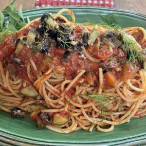 Whatever the origin, this dish is a winner for sure. Its pungent flavor combo of anchovies, olives, garlic, red pepper flakes, white wine, oregano and, here, crunchy dill pickles (in place of traditional capers) in a savory tomato sauce tossed with your favorite pasta is aromatic, savory, umami-rich and ready in about thirty minutes with pantry staples. Hope you give this easy recipe a try. Mangia bene!