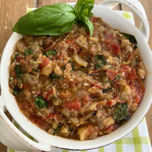 Whole eggplants are roasted until tender, then their meaty flesh is scooped out (as in my eggplant polpette recipe) and combined with roasted tomatoes, onions, garlic and even hot pepper (if you choose) along with fresh basil and spices.