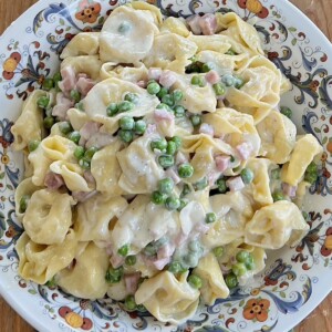 Tortellini alla panna, which literally translates from Italian as tortellini with cream, is the most enjoyable use of leftover holiday ham (and peas) in my humble opinion! You’ll often find a very close version of this dish called tortellini della nonna (a.k.a., grandmom’s pasta) in Italian restaurants across the northeast U.S. Usually, it’s made with either prosciutto cotto or prosciutto crudo instead of baked ham.